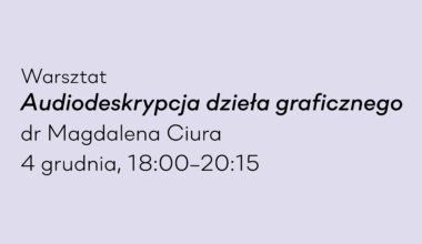 Czytaj więcej 2 minuty czytania AAktualności Warsztat Audiodeskrypcja dzieła graficznego | dr Magdalena CiurabyTriennial12 listopada 2025 Warsztat Audiodeskrypcja dzieła graficznego Prowadzenie: dr Magdalena Ciura 4 grudnia, 18:00 – 20:15 Galeria Centrum, Międzynarodowe Centrum Sztuk Graficznych…