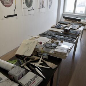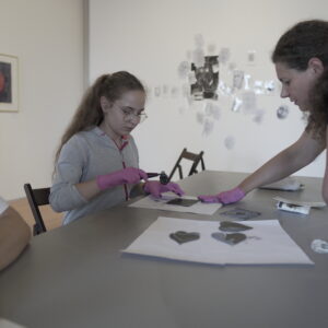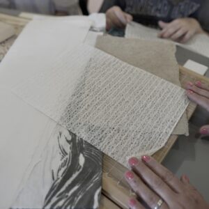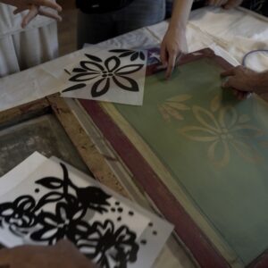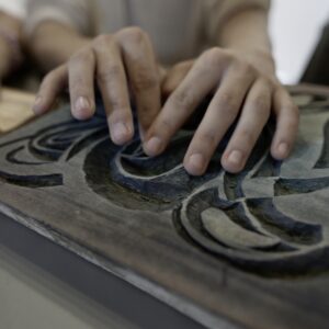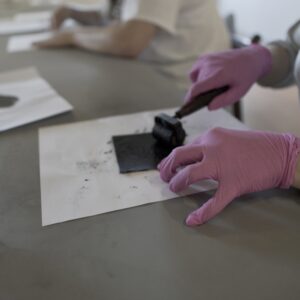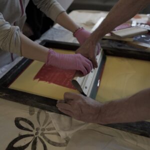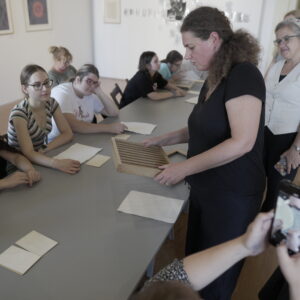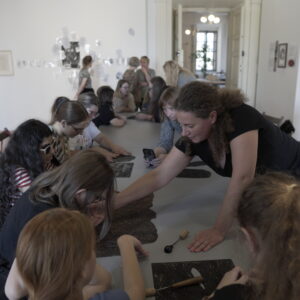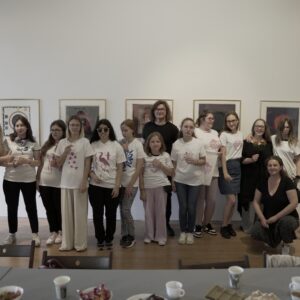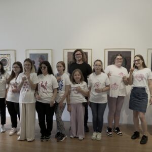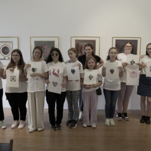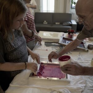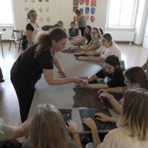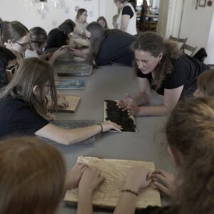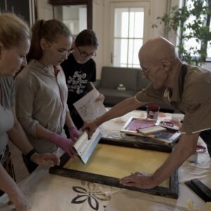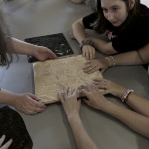 Przez dwa dni nasza galeria była polem graficzno-olfaktorycznego eksperymentu. Dziesięć Uczennic z Centrum dla Niewidomych i Słabowidzących w Krakowie wzięło udział w warsztatach prowadzonych przez Martę Bożyk, Katarzynę Wojtygę, Krzysztofa Mikosia i Jakuba Pietrynkę. Pierwszego dnia Uczestniczki poznały graficzne instrumentarium przez pełną ciekawostek narrację oraz dotykowe i węchowe studiowanie drewnianych matryc, sit do serigrafii oraz ręcznie czerpanych papierów. Z pomocą Prowadzących Dziewczyny samodzielnie stworzyły linoryty i druki na T-shirtach.
